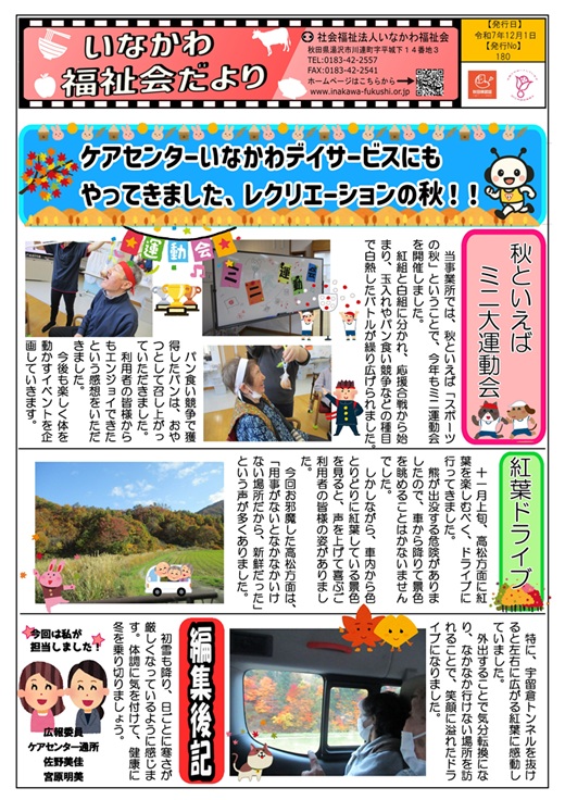 12月の福祉会だよりを掲載しました。今回は、「ケアセンターいなかわデイサービス」で行われているレクリエーションについての特集です。普段行っているものとは違い、秋ならではのレクリエーションですので、ぜひご一読ください。