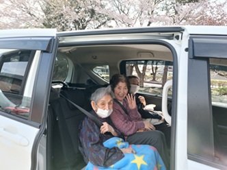 4月16日と17日の2日間、スマイルケアみつなしでは、梨木公園と真人公園の桜を見にいきました。梨木公園では鯉のぼりと桜の競演を楽しみ、毎年恒例の真人公園駐車場では、桜を見ながらおやつの饅頭とジュースを召し上がり、楽しい時間を過ごしました。