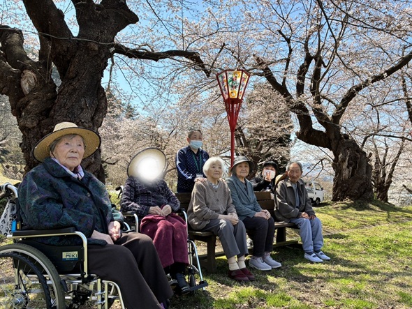 健寿苑では、4月13日から増田町の真人公園に数回に分けて花見に行きました。写真の日は天気に恵まれ、春の陽気の中、満開に近い桜と春の訪れを体全体で感じた入居者の皆様はとても喜んでいました。今年もいい桜が見れて、とても良い一日になったようです。